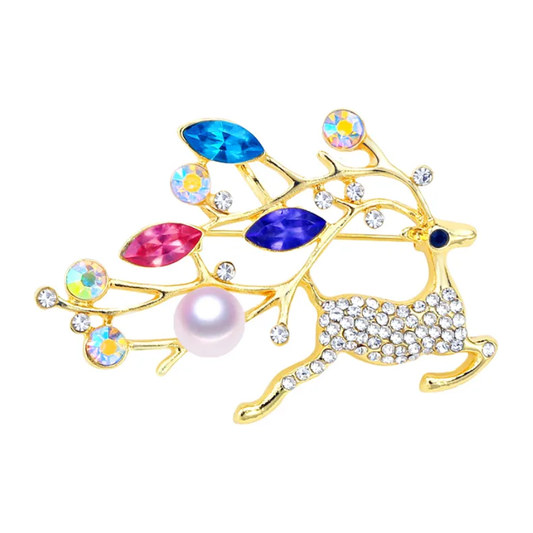 Buynuzları rəngli kristallarla bəzədilmiş maral dizaynlı mirvari broşStokda yoxdur