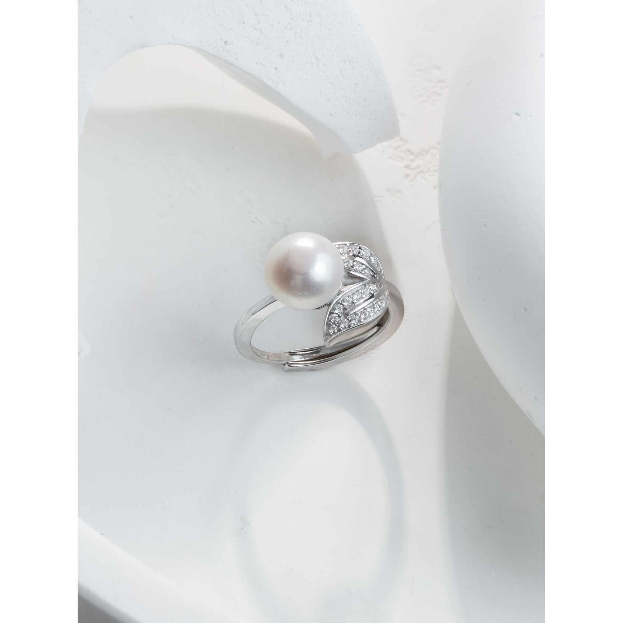 Pearl jewelry set with necklace, ring, and earrings on a white background