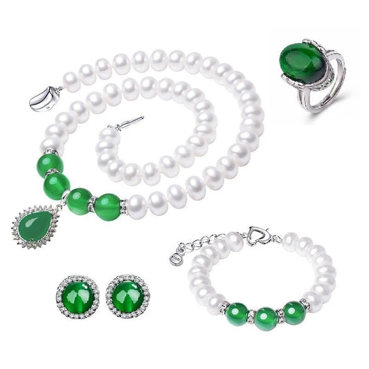Yaşıl aqat daşlarla bəzədilmiş ağ mirvari dəstStokda yoxdur