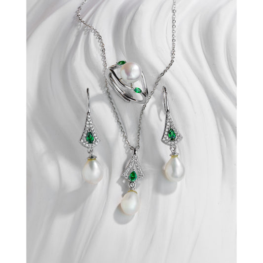 Yaşıl və ağ rəngli zirkon qaşlı italyan gümüşü premium mirvari dəstStokda yoxdur