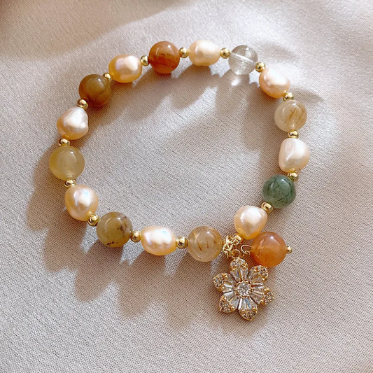 Qızılı toplar və kvars daşlarla hazırlanmış ürək kulonlu mirvari qolbaqStokda yoxdur