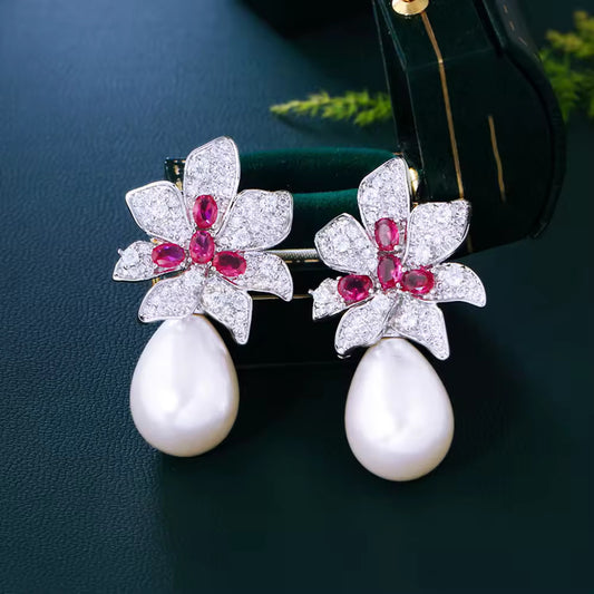 Çəhrayı və ağ zirkon qaşlarla bəzədilmiş ecazkar mirvari sırğaStokda yoxdur